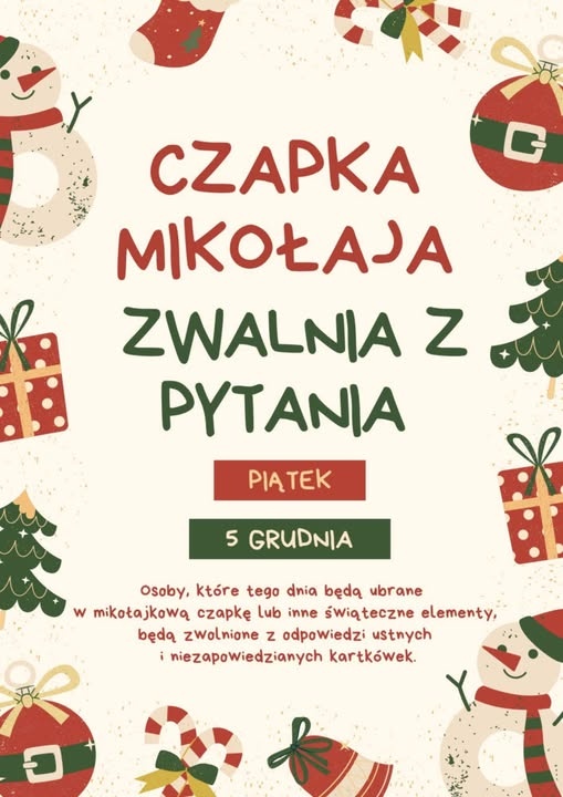 - 5 grudnia wszyscy uczniowie, którzy założą mikołajkową czapkę lub inne świąteczne akcenty, będą zwolnieni z odpowiedzi ustnych oraz niezapowiedzianych kartkówek.